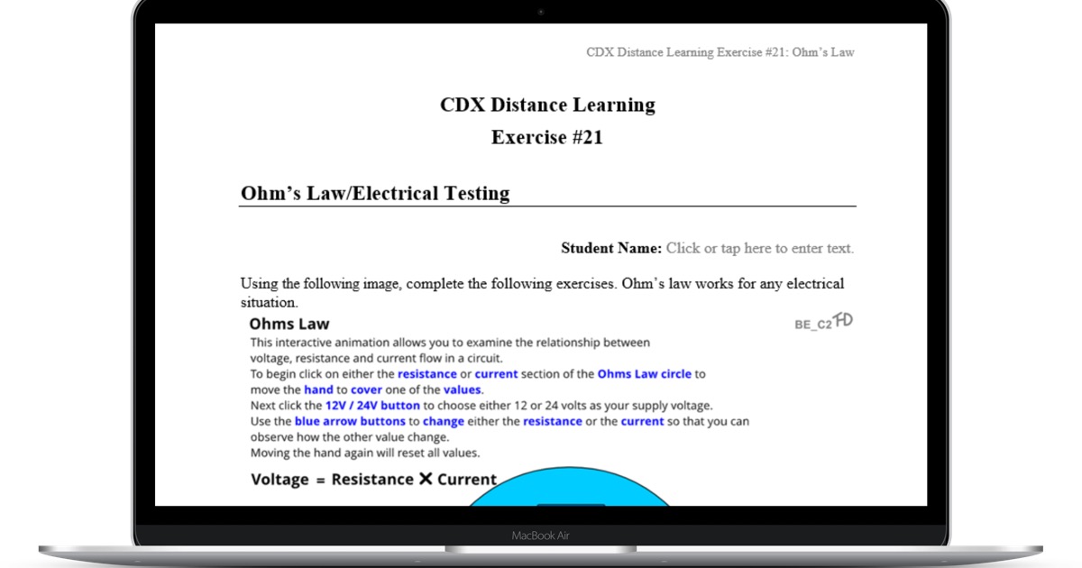 CDX Distance Learning Exercise #21 is an Ohm’s Law/Electrical Testing assignment.