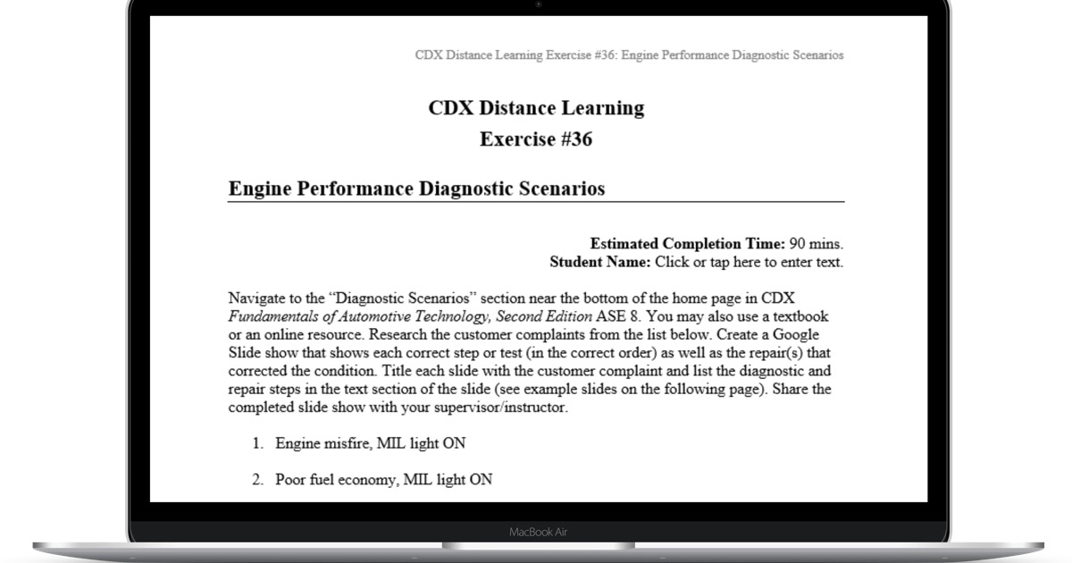CDX Distance Learning Exercise #36 is a presentation assignment on Engine Performance Diagnostic Scenarios.
