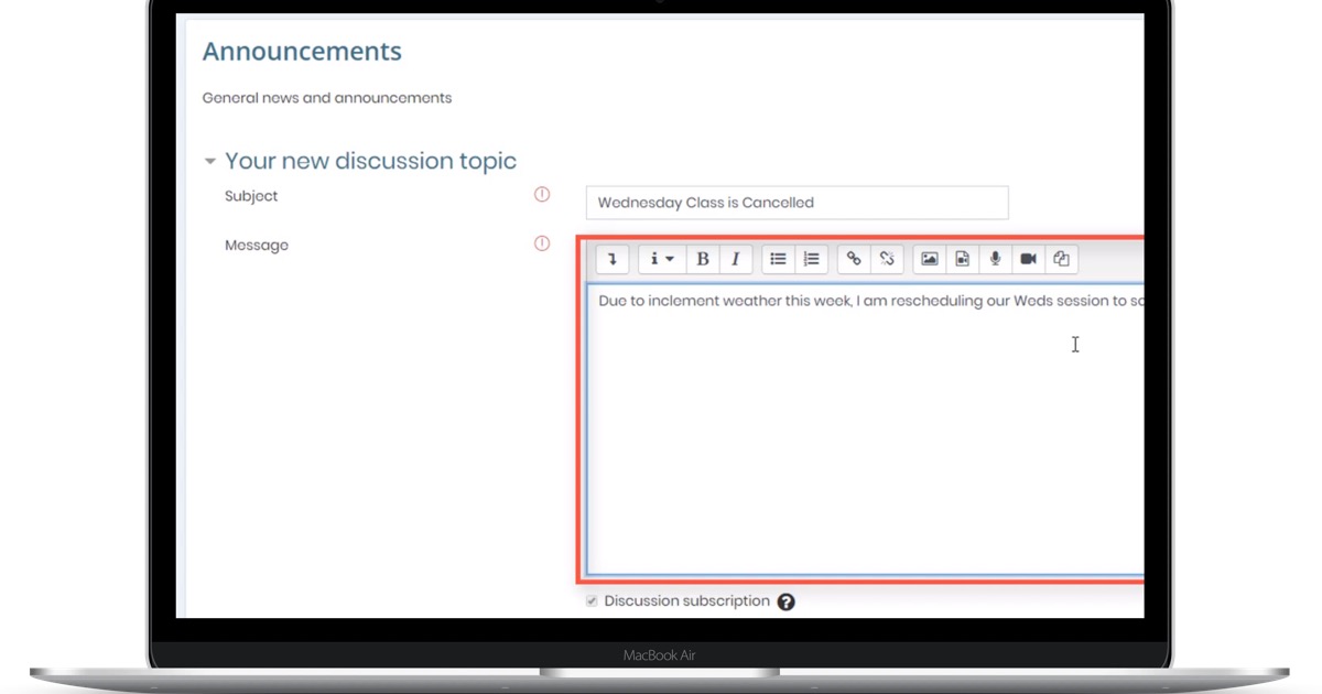 Instructors can craft and send one or more course notifications using the “Announcements” block on the course homepage. Click here for a walkthrough document on using this feature, or watch the following video for a quick tutorial on how to post and pin important course announcements.