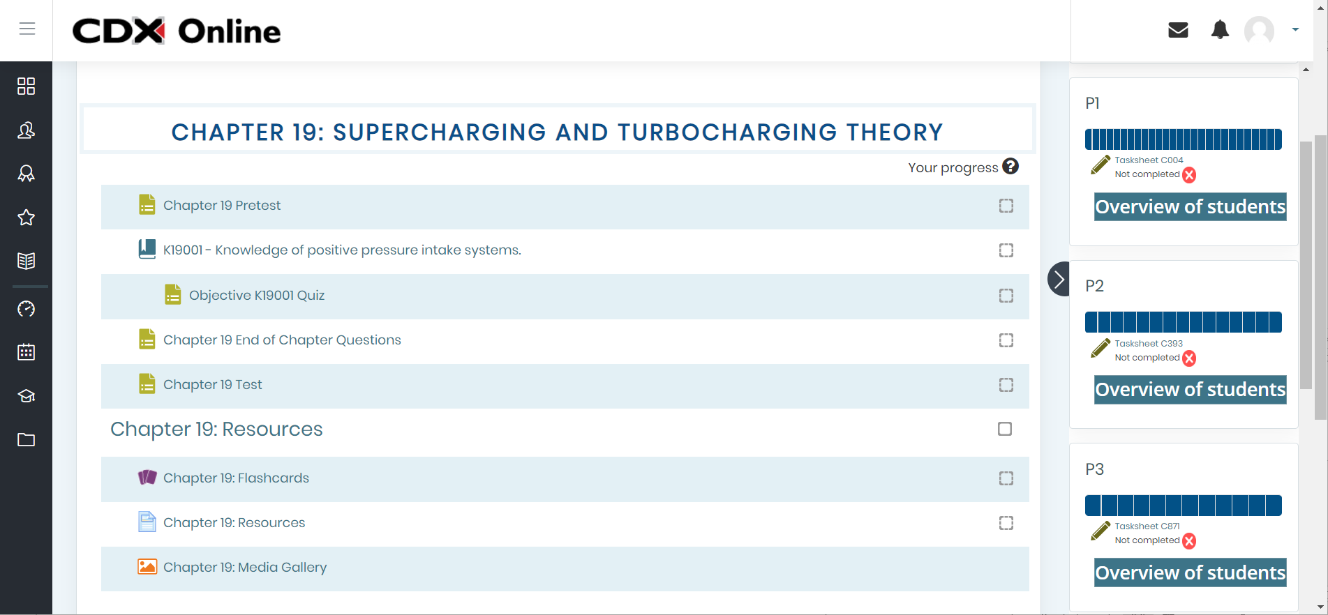- Course statistics, completion progress, and task tracking reports provide essential data at a glance